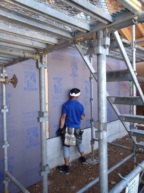 2025年10月8日 / 最終更新日時 : 2025年10月8日 gotokota 建築 耐力壁 外部に耐力壁を貼っていきます。 今まではダイライトを使っていたのですが、今回はタイガーEXプログレ。 安いし、強度もあるし、軽いしいい所ばかり、水に少々弱いのが難点。 外壁をぐるっと回す事で、耐力を付け気密も上がります。 それでも重いので、大工さんには感謝です。 コメントを残す コメントをキャンセルコメントを投稿するにはログインしてください。