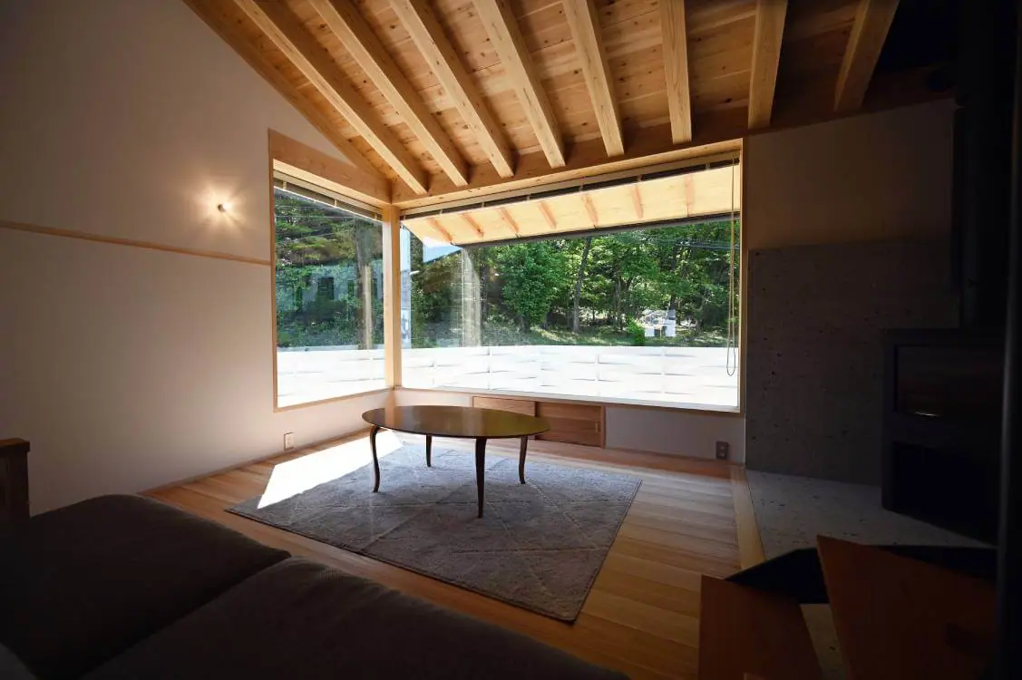 大洞の家2は北斜面の小高い団地の南端に建っています。敷地の南面、東面には道路を挟んで山深く豊かな自然が残されていました。[この自然をどう建築に取り込めるか]が計画をするうえで重要な方向性となりました。リビングでは広々とした空間の中で、ダイニングでは少し天井高を抑えて落ち着きのある中で、そしてキッチンに立ってはどちらもこの自然を眺められるよう計画しました。そしてアルミの編み込み塀をぐるっと回す事で道路側からの視線を遮りました。空間が単調にならないように、リビングの床高や天井高を調整し、階段に曲面を取り入れたり中二階を張り出させたりしてそれぞれの居場所が快適になるように計画しています。素材においても経年変化に耐えられる、無垢の木、石、鉄などで建物を構成しています。建物が竣工し、久々に訪れた大洞の家2のリビングのソファーに座っていると、窓いっぱいに緑が取り込まれ、何時間でも外を眺めていられるような感じがしました。ゆっくりと時間が流れる豊かな空間にできたのではと思いました。